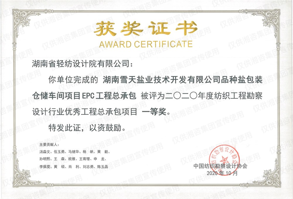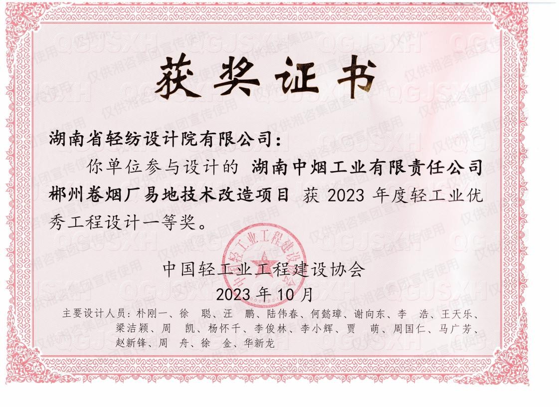 中國輕工業工程建設協會輕工業優秀工程設計一等獎
