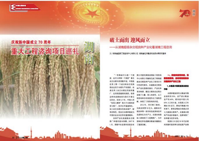 省咨詢公司完成的《湖南超級雜交稻良種產業化工程可行性研究報告》作為湖南唯一申報的工程咨詢成果,參展了中國工程咨詢協會“慶祝新中國成立70周年重大工程咨詢項目巡禮”,在《中國工程咨詢》雜志上刊登展示。公司工程咨詢成果獲此殊榮,體現了公司咨詢成果的品質和質量達到了一流水平,得到了國家和湖南省工程咨詢行業的高度關注和廣泛認可。