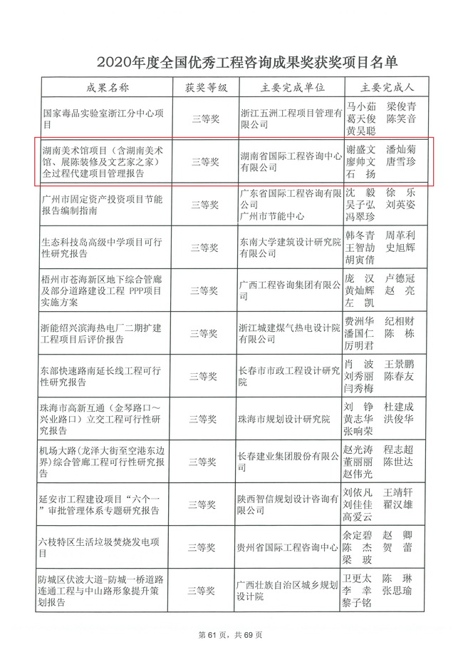 20213月5日,中國工程咨詢協會公布了“2020年度全國優秀工程咨詢成果獎獲獎名單”的通知。省咨詢公司有3項工程咨詢成果榮獲國家優秀工程咨詢成果獎,其中投融資與戰略咨詢部完成的《湖南現代農業集團發展戰略規劃(2020—2024)》榮獲國家優秀工程咨詢成果獎二等獎,生態規劃咨詢部完成的《湖南省洞庭湖水環境綜合治理專題研究報告》、建設工程管理咨詢部完成的《湖南美術館項目(含湖南美術館、展陳裝修及文藝家之家)全過程代建項目管理報告》榮獲國家優秀工程咨詢成果獎三等獎。