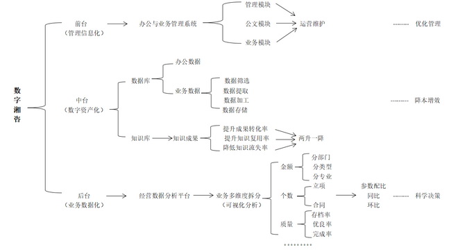 目前,公司整體信息化建設已初步形成以辦公和業務管理系統為前臺依托力、以知識庫平臺為中臺支撐力、以經營數據分析平臺為后臺驅動力的“三駕馬車”并駕齊驅的數字化運營模式,下一步,公司將圍繞“管理信息化——數據資產化——業務數字化”轉型路線,不斷促進公司優化管理、降本增效和科學決策,在深入貫徹省委省政府“數字湖南、數字政府、數字社會”戰略進程中,提升“數字湘咨”品牌影響力,助力“數字湖南”高質量發展。