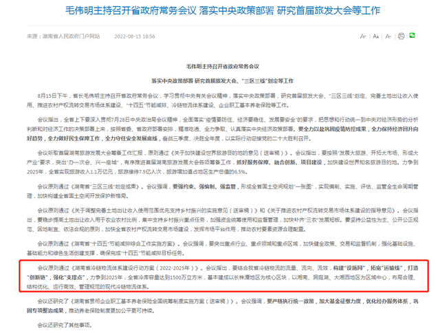 2022年8月15日下午,省長毛偉明主持召開省政府常務會議,研究審議通過了省咨詢公司編制的《湖南省冷鏈物流體系建設行動方案(2022-2025年)》課題,會議指出要結合我省冷鏈物流的流量、流向、流效,構建“設施網”,拓寬“運輸線”,打造“創新鏈”,強化“支撐點”,力爭到2025年,全省冷庫容量達到1500萬立方米,基本建成以長株潭地區為核心區塊,以湘南、洞庭湖、大湘西地區為區域中心,布局合理、結構優化、運行高效、管理規范的現代冷鏈物流體系