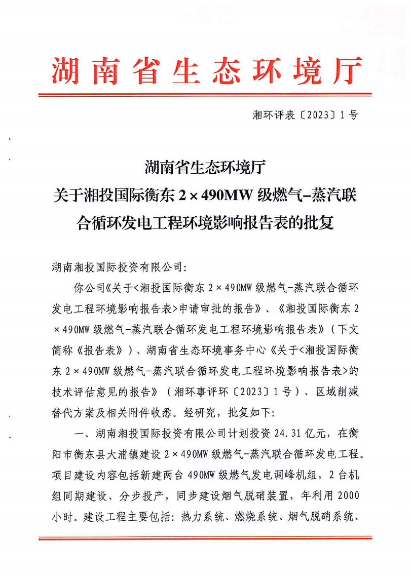 2023年3月9日,由省咨詢公司編制的《湘投國際衡東2×490MW級燃氣-蒸汽聯合循環發電工程環境影響報告表》順利獲得湖南省生態環境廳批復(湘環評表[2023]1號),為項目后續依法合規開工建設奠定了堅實基礎。