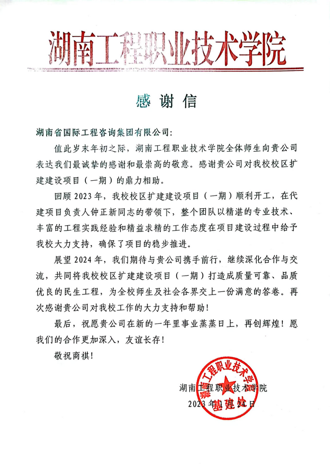 近日,湘咨集團收到來自湖南省發展改革委、湖南工程職業技術學院發來的感謝信。信中對集團代建項目經理鐘正新同志及代建管理團隊在該校校區擴建建設項目(一期)代建管理方面的專業、務實、高效給予高度贊譽,對投融資與戰略咨詢事業部蔡丹丹同志積極協助配合美麗中國評估組在湘聯絡協調、開展環境基礎設施摸底調查等工作給予充分肯定。