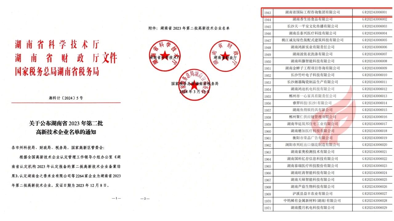 近日,湖南省科學技術廳、湖南省財政廳、國家稅務總局湖南省稅務局公布了湖南省2023年第二批高新技術企業名單,湘咨集團再次榮獲“高新技術企業”稱號。