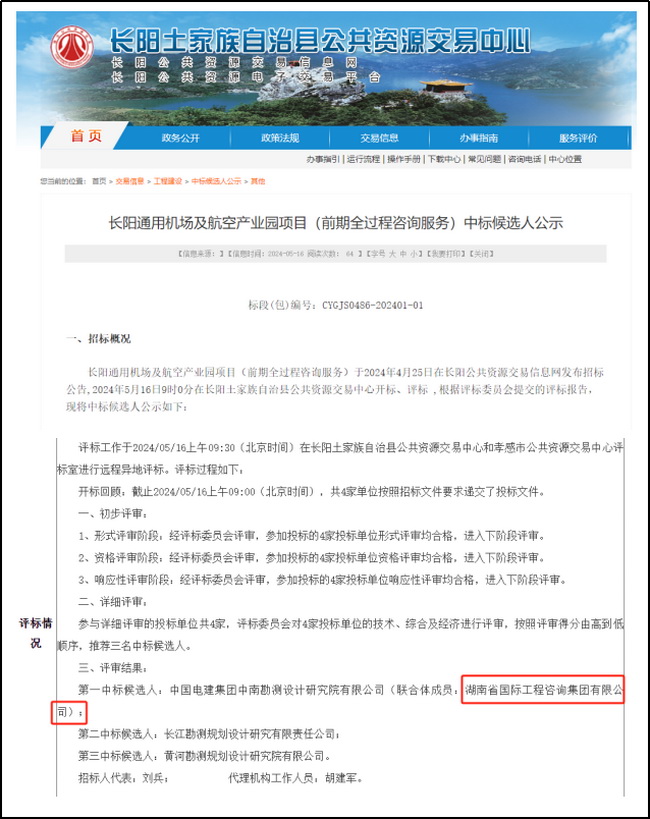 5月16日,湘咨集團(tuán)與中國電建集團(tuán)中南勘測設(shè)計研究院有限公司(下稱“中國電建中南院”)聯(lián)合體成功中標(biāo)長陽通用機場及航空產(chǎn)業(yè)園項目(前期全過程咨詢服務(wù)),中標(biāo)金額996.78萬元。