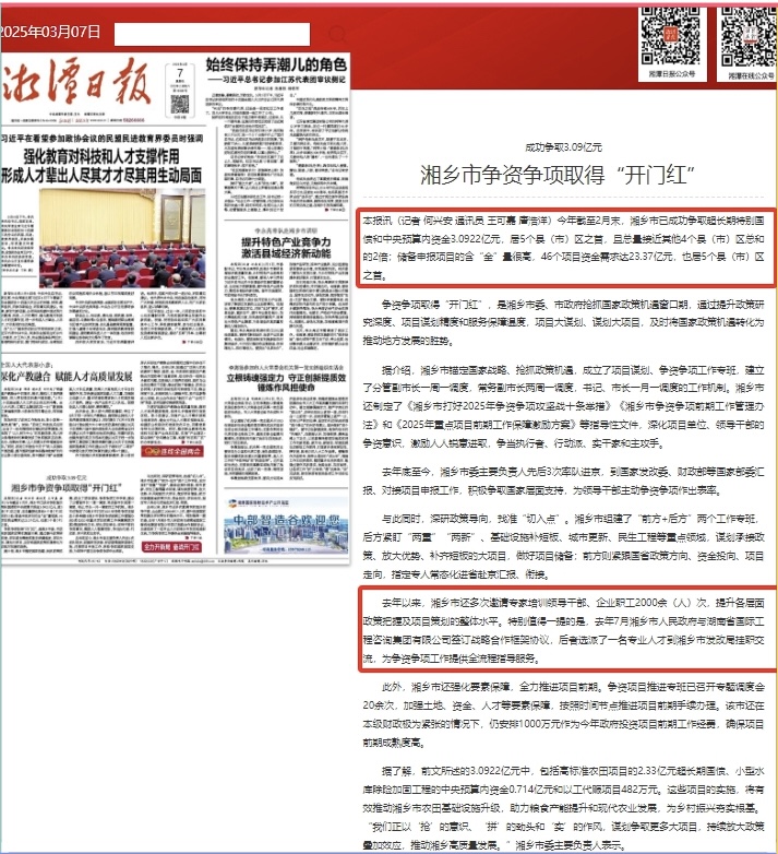 2025年3月6日,據(jù)湘潭日?qǐng)?bào)報(bào)道,截至2月末,湘鄉(xiāng)市成功爭(zhēng)取超長(zhǎng)期國(guó)債和中央預(yù)算內(nèi)資金3.092億元,儲(chǔ)備項(xiàng)目資金需求23.37億元,兩項(xiàng)指標(biāo)領(lǐng)跑湘潭市縣區(qū)。······